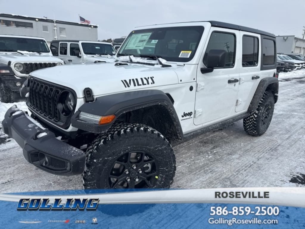 Golling Chrysler Dodge Jeep Ram of Roseville is excited to offer this 2026 Jeep Wrangler Willys in Bright White Clearcoat with Black Cloth. This Wrangler is very well equipped with Convenience Group (2-Door Passive Entry, Front Door Locks, Air Conditioning with Auto Temp Control, Air Filtering, Cluster 7.0" TFT Color Display, Emergency/Assistance Call, Heated Front Seats, Heated Steering Wheel, and Universal Garage Door Opener), Quick Order Package 22W Willys (4-Wheel Drive Swing Gate Decal, 4.10 Rear Axle Ratio, 7 and 4 Pin Wiring Harness, Advanced Brake Assist, Automatic Headlamps, Auxiliary Switches, Black Grille with Gloss Black Rings, Class II Receiver Hitch, Conventional Differential Front Axle, Corning Gorilla Glass, Dana M210 Wide HD Tube Front Axle, Dana M220 Wide Rear Axle, Daytime Running Lamps LED Accents, Deep Tint Sunscreen Windows, E-Locker Rear Axle, Enhanced Adaptive Cruise Control, Front LED Fog Lamps, Full Speed Forward Collision Warning Plus, Injection Molded Black Rear Bumper, LED Premium Reflector Headlamps, Mold in Color Bumper with Gloss Black, Molded in Color Rubicon Highline Flare, MOPAR All-Weather Floor Mats, Off-Road Plus Mode, Power Heated Mirrors, Premium Wrapped Steering Wheel, Security Alarm, Sun Visors with Illuminated Vanity Mirrors, Wheels: 17" x 7.5" Painted Black, Willy's Suspension, and Willys Hood Decal), Steel Power Dome Hood Package (Power Dome Dual Vented Hood), AM/FM radio: SiriusXM with 360L, Delay-off headlights, Front fog lights, Radio: Uconnect 5 with 12.3" Display, Rear Window Wiper/Washer, and Variably intermittent wipers.